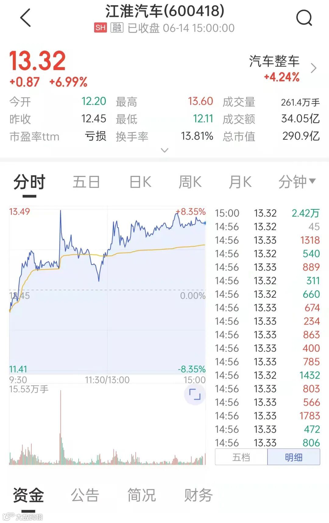 受此消息影响,江淮汽车股价直线拉升,盘中大涨8.35%。截至收盘,江淮汽车涨6.99%。