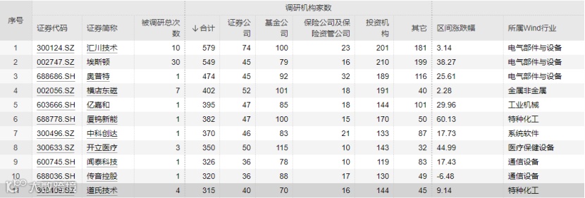 Wind数据显示,6月以来,共有11家公司吸引了超过300家机构调研。其中,被调研次数最多的是机器人行业的汇川技术,共吸引579家机构;埃斯顿、奥普特、横店东磁、亿嘉和也被机构重点关注,分别吸引了549家、474家、402家、395家机构。