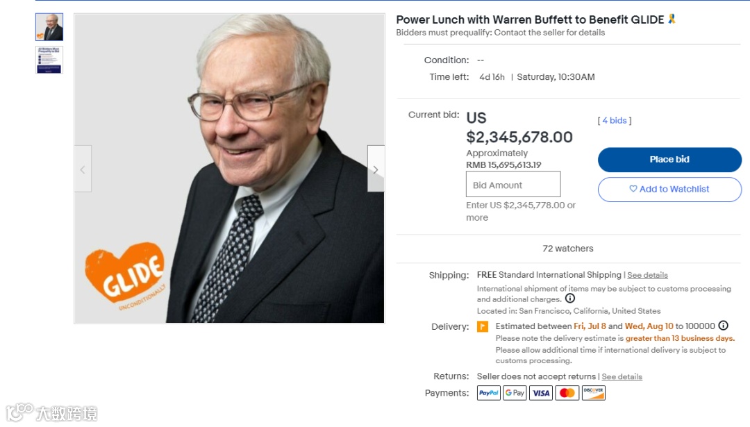 截至北京时间下午6点,巴菲特慈善午餐上架拍卖近11个小时。ebay网站显示,目前仅4人出价,最新出价为2345678美元,约合人民币1570万元,ebay网站未披露该名报价人信息。另外还有72人密切关注价格变化。