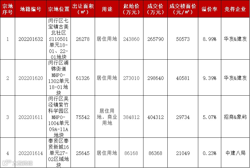 招商蛇口此前获得的3宗地块分别为:招商蛇口62.5亿元竞得普陀区中山北社区C060202单元B3-16地块;招商蛇口联合象屿地产以40.43亿元竞得闵行区吴泾镇紫竹科学园区MHPO-1004单元09A-11A地块;招商蛇口联合香港置地及徐汇城投以47.33亿元竞得徐汇区斜土街道xh128D-06地块。