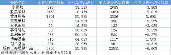 朝阳永续最新统计数据显示,截至6月23日,该机构监测到的逾22000只证券私募产品今年以来的平均收益率为-6.60%。其中,占比近七成、总计14890只股票策略私募产品今年以来平均亏损9.81%,正收益产品占比为16.47%。