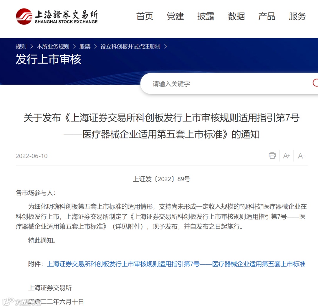 6月10日,上交所发布实施科创板医疗器械企业第五套上市标准适用指引,从核心技术产品范围、阶段性成果、市场空间等方面明确了医疗器械企业适用第五套标准的申报细则。