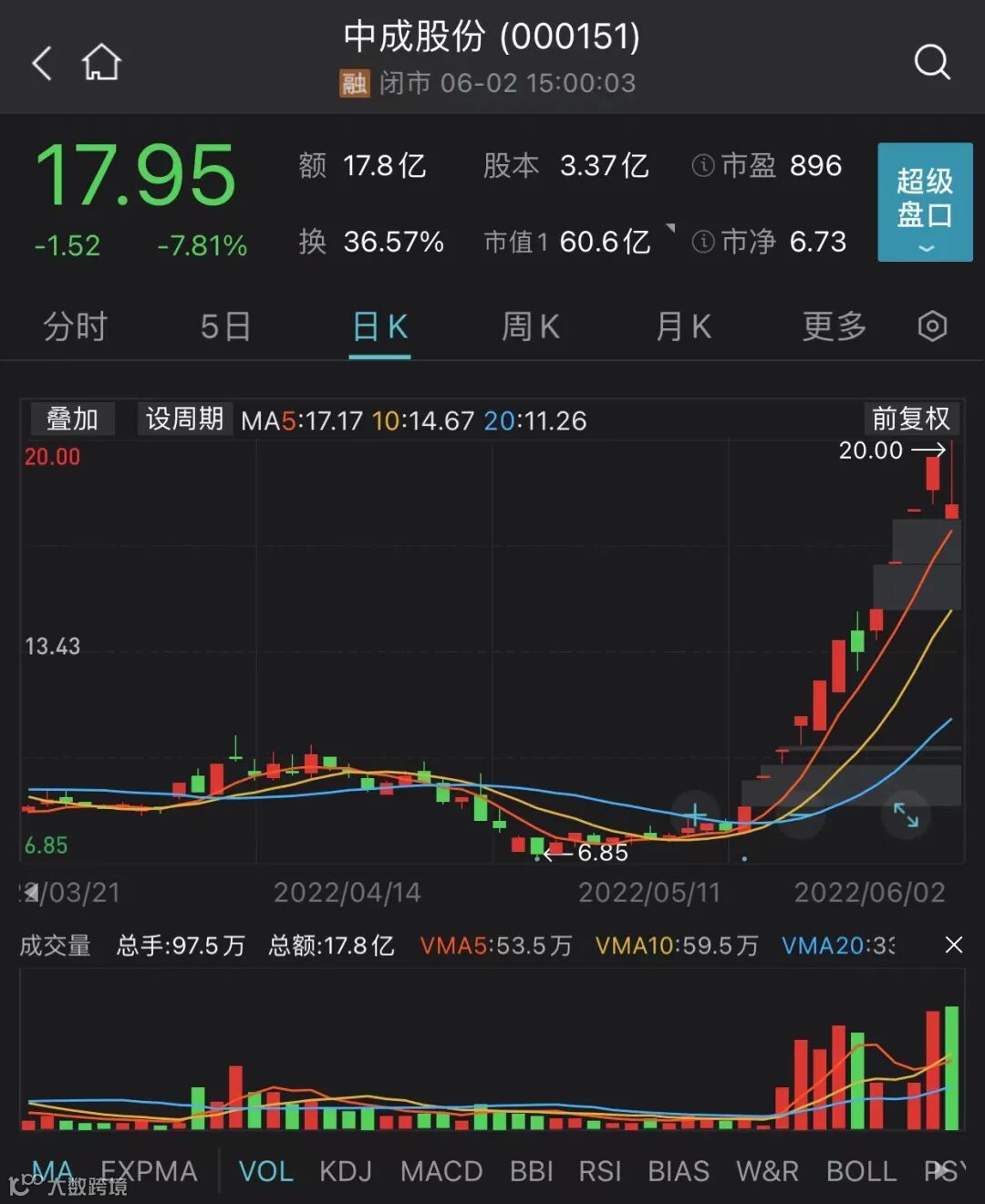 Wind数据显示,中成股份5月份累计涨幅超过140%,并走出11个交易日10个涨停板的行情。截至6月2日收盘,公司股价收报17.95元/股,跌幅达到7.81%。
