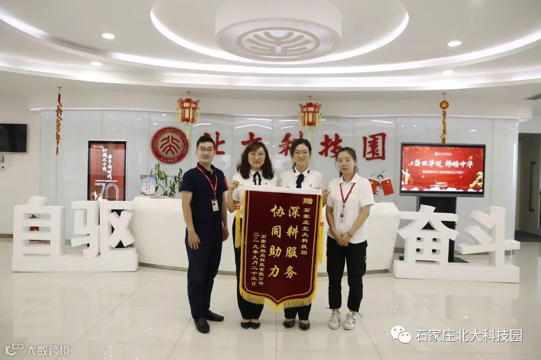 2019年9月23日,在园企业石家庄融尚科技有限公司赠送石家庄北大科技园“深耕服务 协同助力”锦旗,诚挚感谢园区提供迭代式服务、共享全国园区优质资源,协同助力企业快速发展。