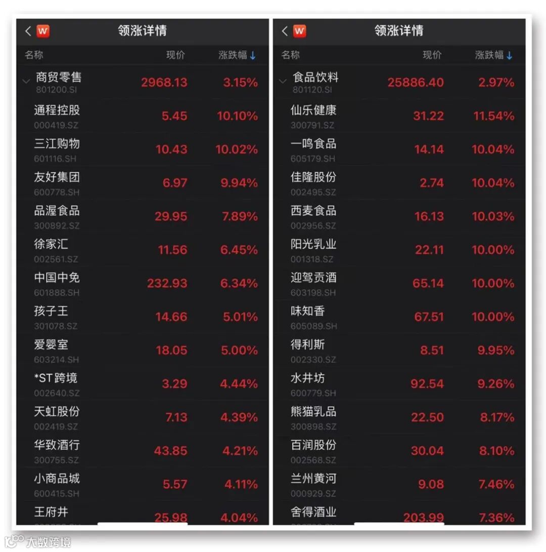 商贸零售行业中,通程控股、三江购物、友好集团涨停。食品饮料行业中,仙乐健康涨逾11%,一鸣食品、佳隆股份、西麦食品、迎驾贡酒等多股涨停,五粮液涨逾5%,贵州茅台涨近2%。