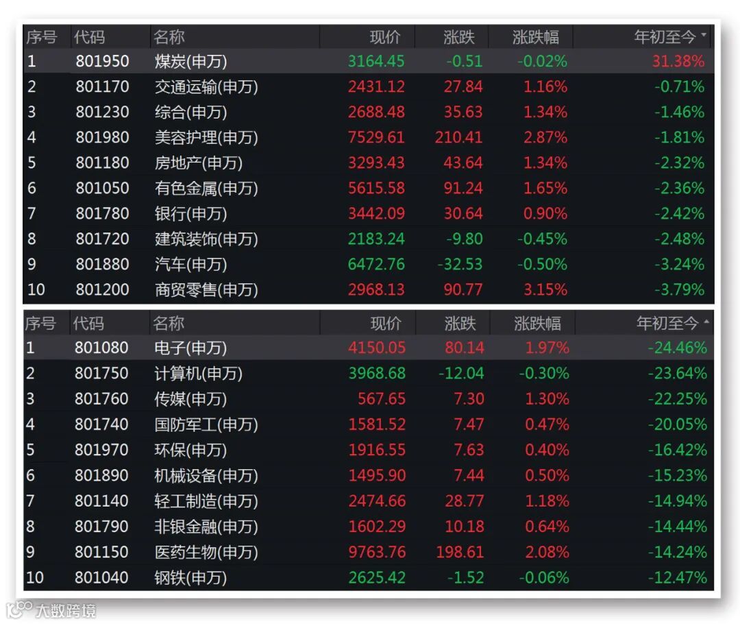 申万一级行业中,商贸零售、食品饮料、美容护理行业涨幅居前,分别上涨3.15%、2.97%、2.87%;汽车、建筑装饰、计算机行业跌幅居前,分别下跌0.50%、0.45%、0.30%。