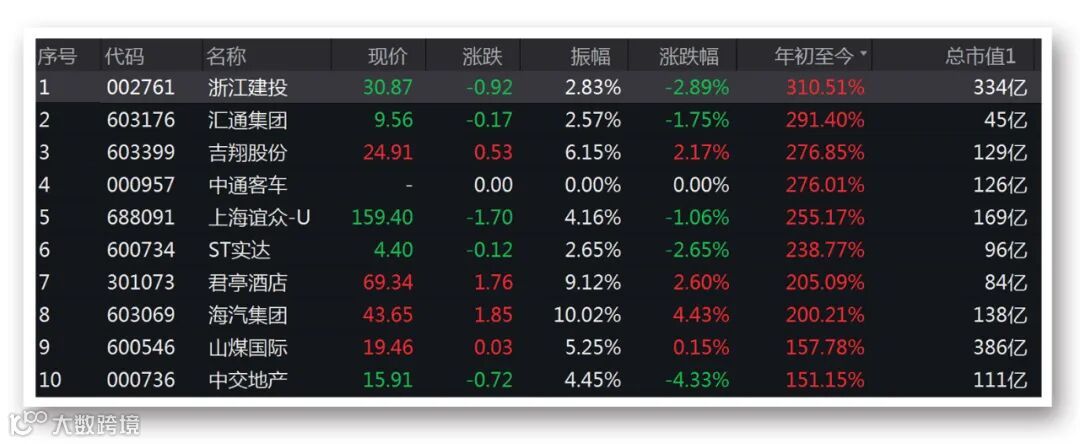 涨幅最大的浙江建投上半年出现两波拉升,共计有27个涨停。