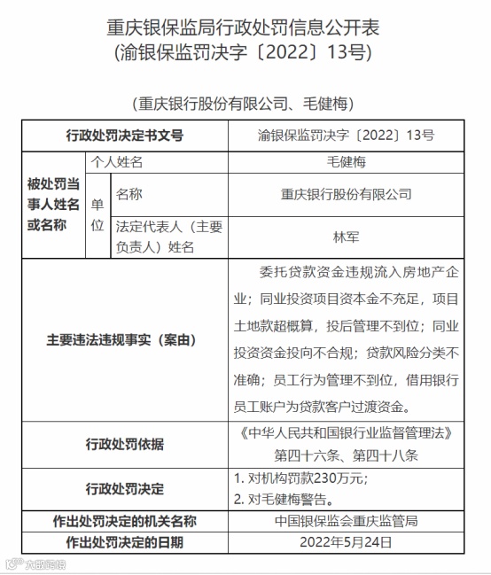 例如,重庆银行被罚款230万元,案由包括:同业投资项目资本金不充足,项目土地款超概算,投后管理不到位;同业投资资金投向不合规;员工行为管理不到位,借用银行员工账户为贷款客户过渡资金。