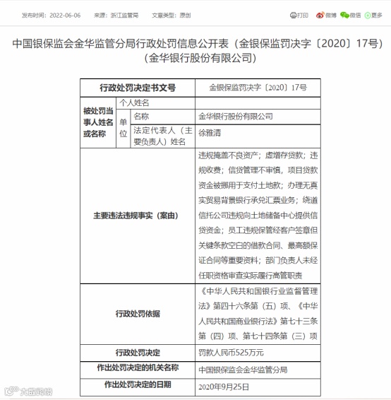 罚单显示,金华银行被罚525万元,4名相关责任人被警告或罚款。据悉,该行涉及违规掩盖不良资产、虚增存贷款、违规收费、办理无真实贸易背景银行承兑汇票业务、绕道信托公司违规向土地储备中心提供信贷资金等8项违规案由。