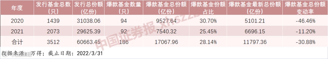 据统计,2020年、2021年全市场共发行爆款基金186只,发行份额合计1.71万亿份,占公募基金发行总规模的28.14%。爆款基金也成了彼时行业最热的关键词之一。