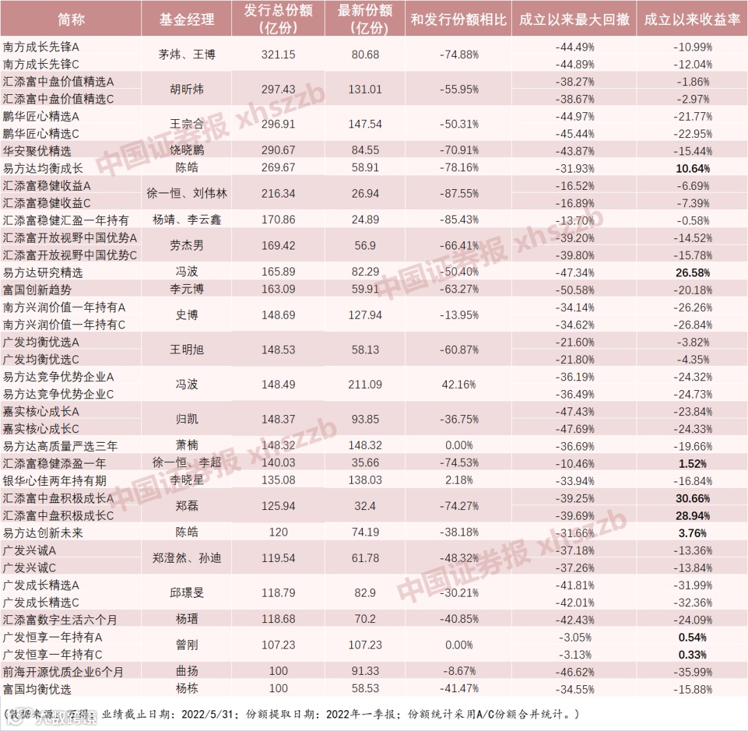 数据显示,截至今年一季报,这25只基金中,最新份额(A/C份额合并统计)仍超百亿的仅存7只;截至今年5月31日,以上基金成立以来回报率为正的仅有6只(A或C份额的统计数据结果相同)。