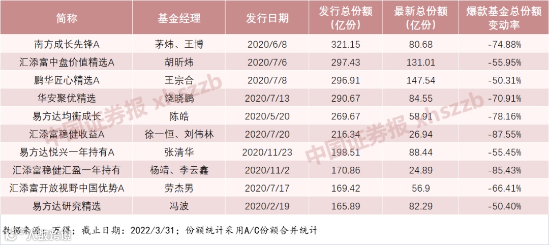 截至今年一季度末,186只爆款基金份额规模合计1.18万亿份,缩减超过30%。其中,规模超百亿元的47只基金中有36只份额跌至百亿元以下,18只不足50亿份。当时募集规模前十大的爆款基金,份额缩水幅度均超过50%,最高的达87.55%。