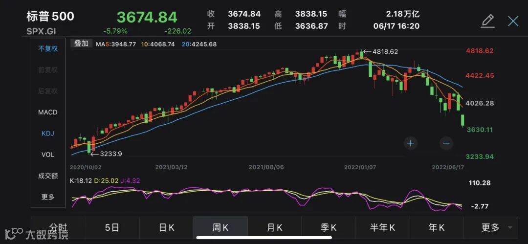 本周美股收盘,道指连创一年半新低逼近熊市,标普全周跌近6%,创下2020年3月以来的最大单周跌幅。