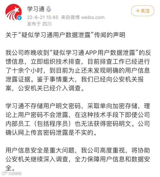 学习通在声明中称,公司昨晚收到“疑似学习通APP用户数据泄露”的反馈信息,立即组织技术排查,目前排查工作已经进行了十余个小时,到目前为止还未发现明确的用户信息泄露证据。鉴于事情重大,公司已经向公安机关报案,公安机关已经介入调查。
