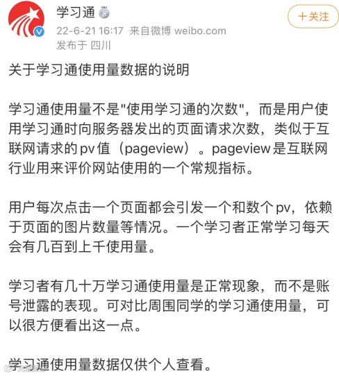在这份说明中,学习通指出,学习通使用量不是“使用学习通的次数”,而是用户使用学习通时向服务器发出的页面请求次数,学习者有几十万学习通使用量是正常现象,而不是账号泄露的表现。