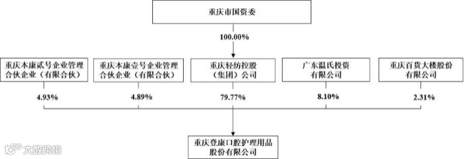 从公司股权结构来看,登康口腔控股股东为轻纺集团,实际控制人为重庆市国资委。截至招股说明书签署日,直接持有公司1.03亿股股份,占发行前总股本的79.77%。此外,温氏投资持有公司8.1%股份,为公司单一第二大股东。