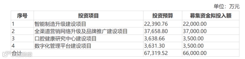 登康口腔计划募资6.6亿元,其中,2.2亿元用于智能制造升级建设项目,3.7亿元用于全渠道营销网络升级及品牌推广建设项目,3500万用于口腔健康研究中心建设项目,3500万元用于数字化管理平台建设项目。