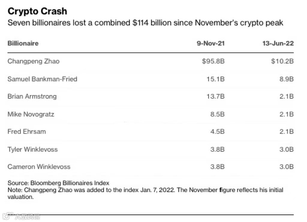 根据彭博亿万富翁指数,自去年11月9日比特币达到近69000美元的历史新高,到今年6月14日比特币跌至2020年12月以来新低,币安交易所创始人赵长鹏、FTX交易所创始人Sam Bankman-Fried(SBF)、Coinbase交易所的Brian Armstrong等七名加密货币领域亿万富翁的财富总共缩水1140亿美元。
