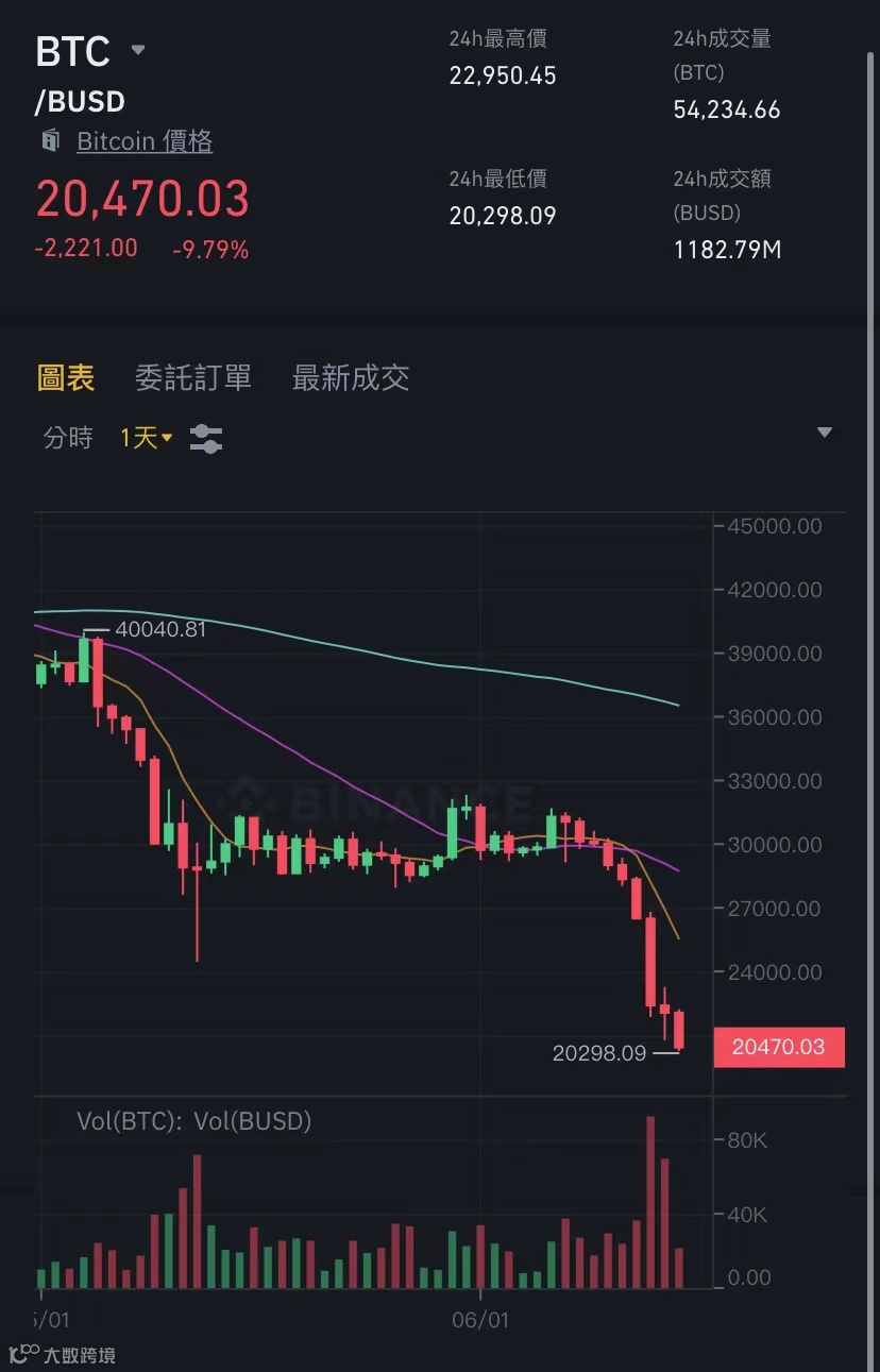 比特币连跌数日,下探20000美元大关,创下2020年12月以来的最低水平。币安数据显示,截至6月15日下午5时,比特币价格报20470美元,较上一个交易日下跌近10%。