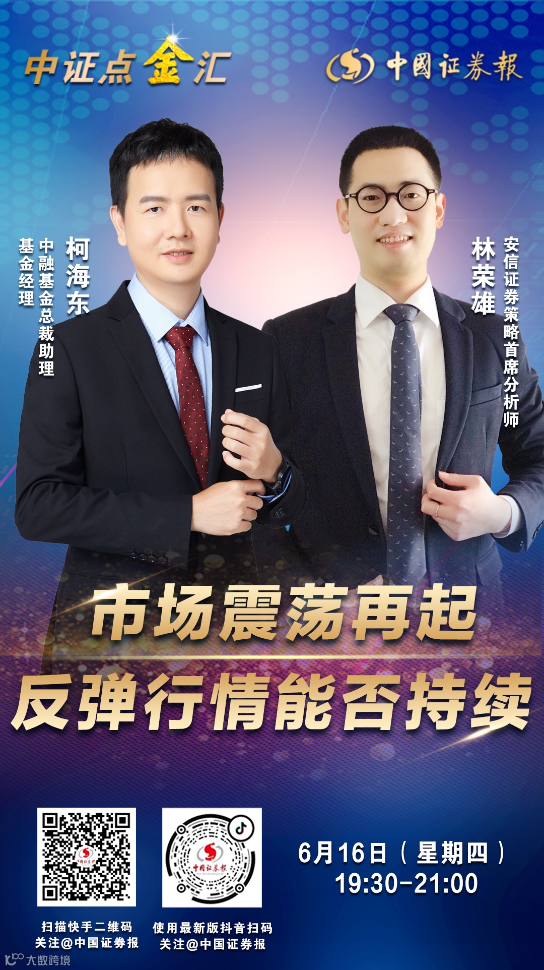 6月16日(周四)晚7点半,中融基金总裁助理、基金经理柯海东以及安信证券策略首席分析师林荣雄,将做客中国证券报“中证点金汇”直播间,围绕“市场震荡再起 反弹行情能否持续?”为您在线答疑解惑。