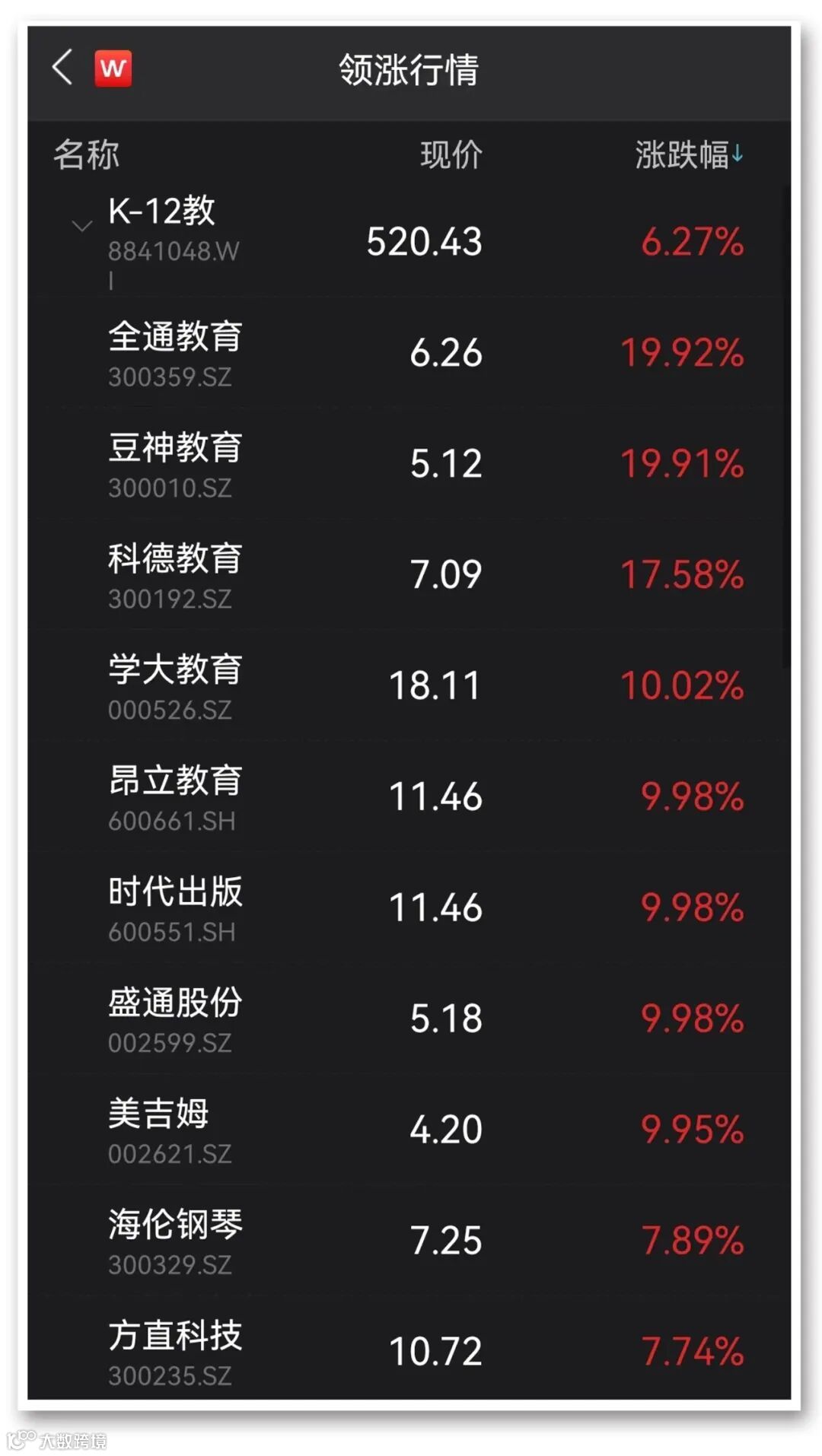 今日,教育相关概念板块表现突出,部分A股及港股标的出现大涨行情。