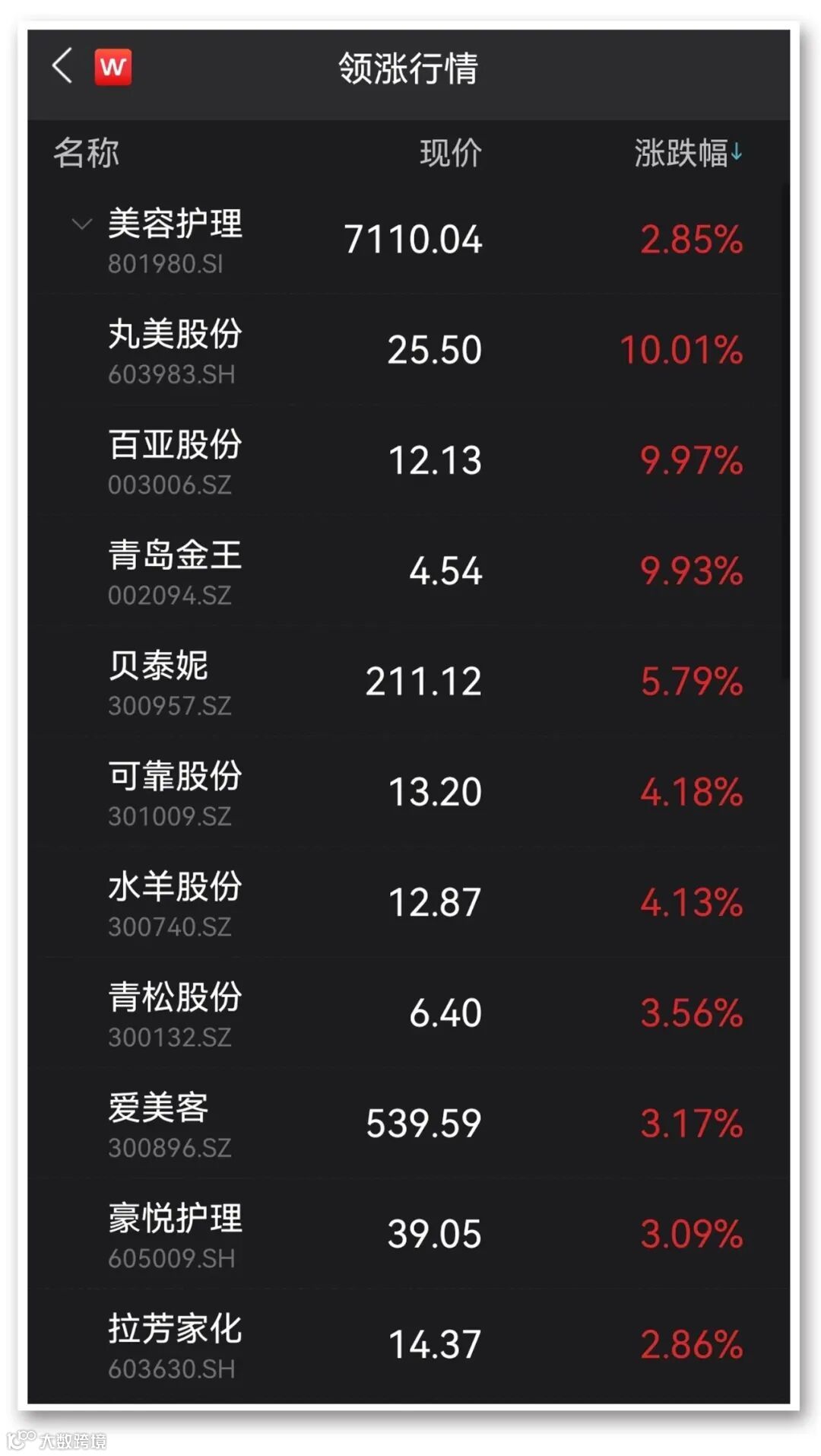 美容护理板块以2.85%的涨幅位居第三位。其中,丸美股份、百亚股份、青岛金王集体涨停,贝泰妮、水羊股份、可靠股份、爱美客等涨幅居前。