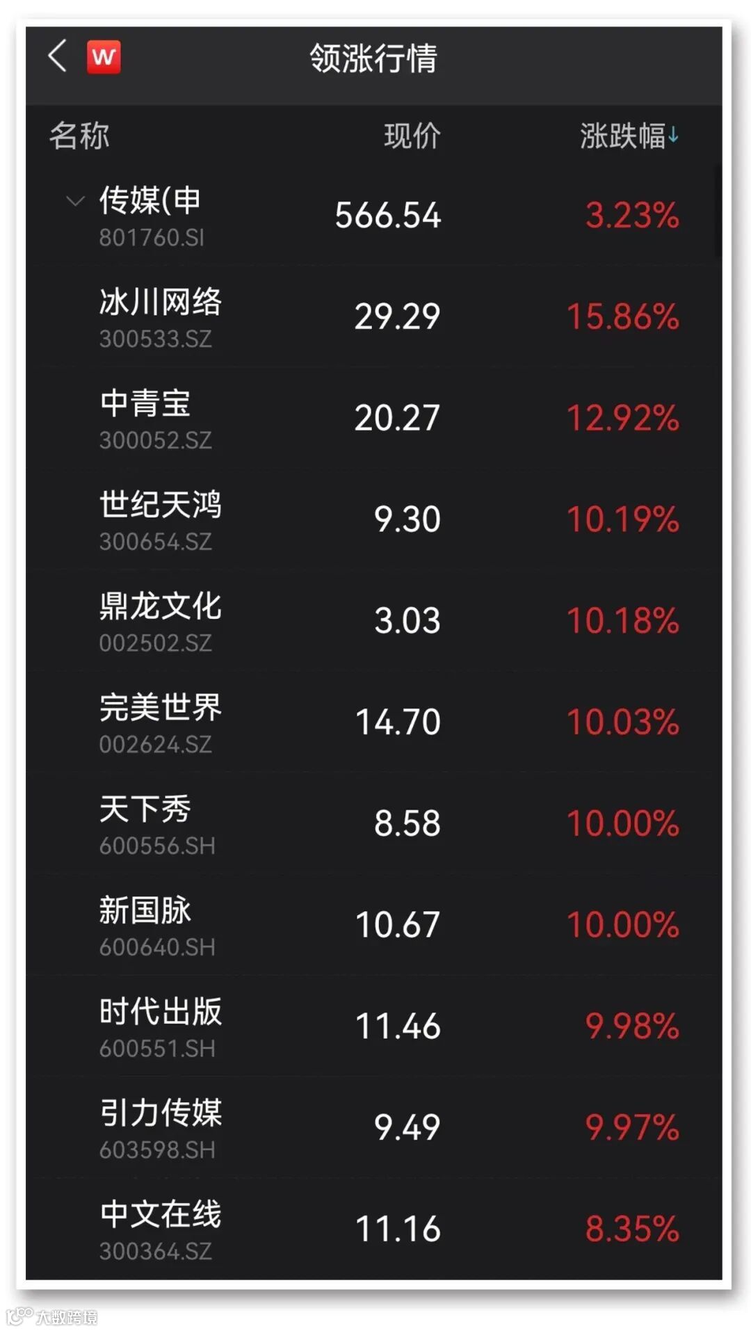 今日31个申万一级行业多数翻红,传媒板块以3.23%的涨幅领涨,多只个股涨停。