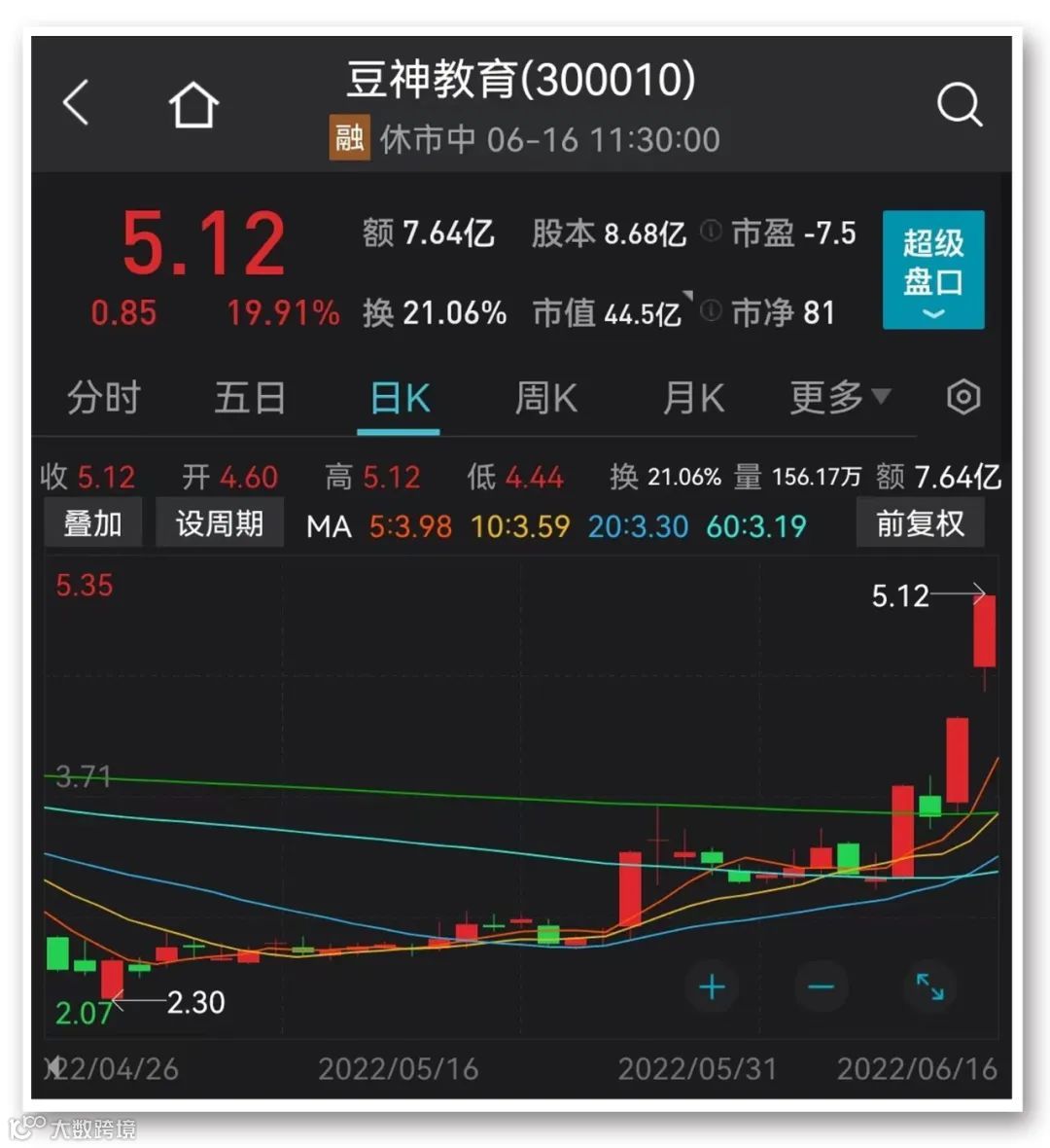 今日上午,新东方在线股价再度大涨近60%,近5个交易日大涨近5倍,6月以来累计涨幅已超6倍。A股教育股也极为火爆,豆神教育4个交易日斩获3个“20CM”涨停。