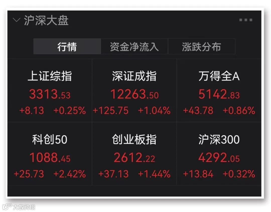 Wind数据显示,截至午间收盘,上证指数、深证成指、创业板指分别上涨0.25%、1.04%、1.44%。