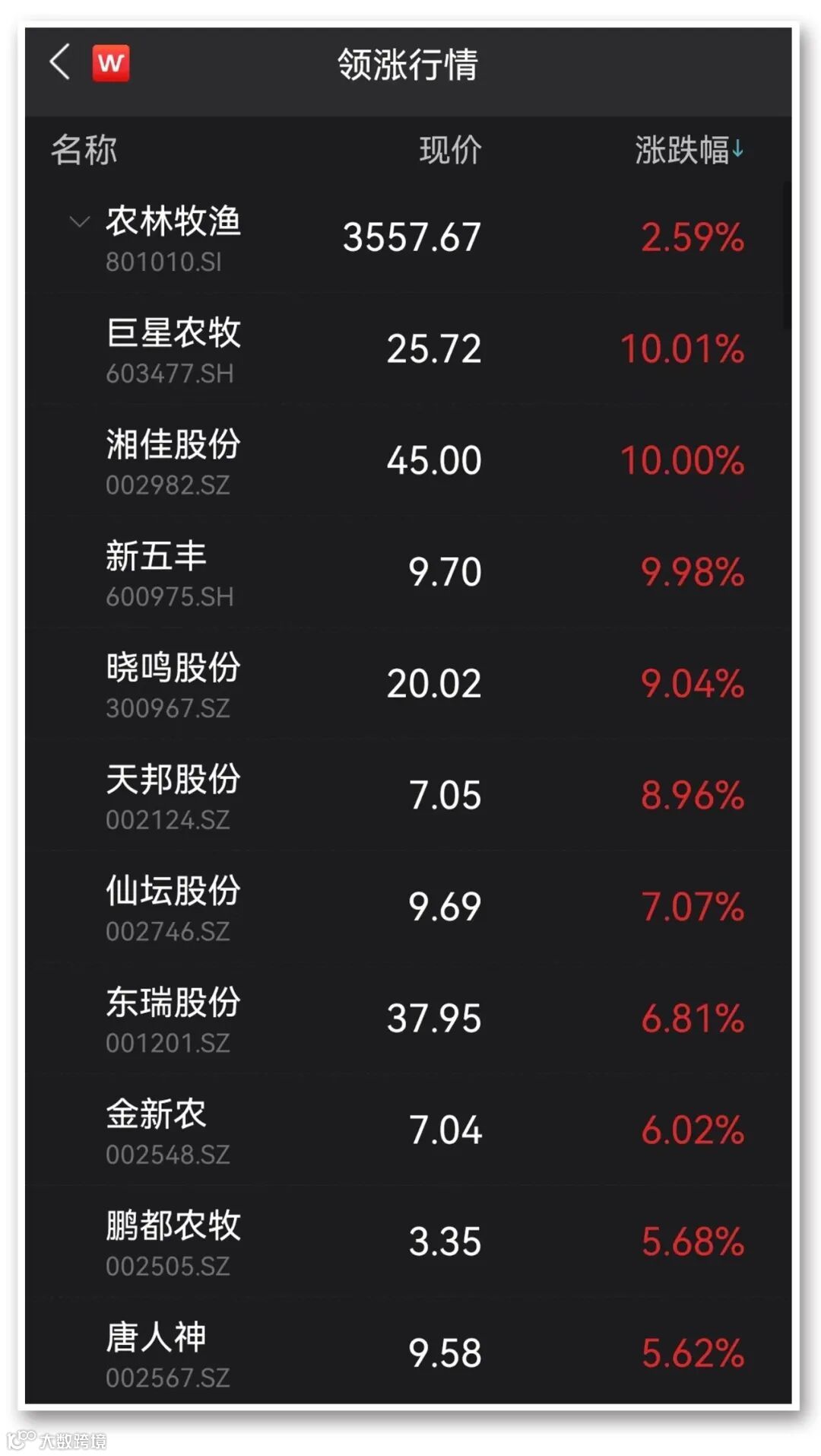 农林牧渔板块今日也有不错表现。Wind数据显示,截至午间收盘,板块涨2.59%,其中巨星农牧、湘佳股份、新五丰等个股涨停,晓鸣农牧、天邦股份等个股涨幅居前。