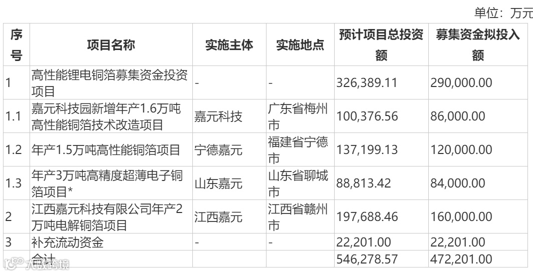 嘉元科技公告称,本次发行募投项目主要用于在广东、山东、福建等地建设高性能锂电铜箔及在江西建设高端标准铜箔生产线。