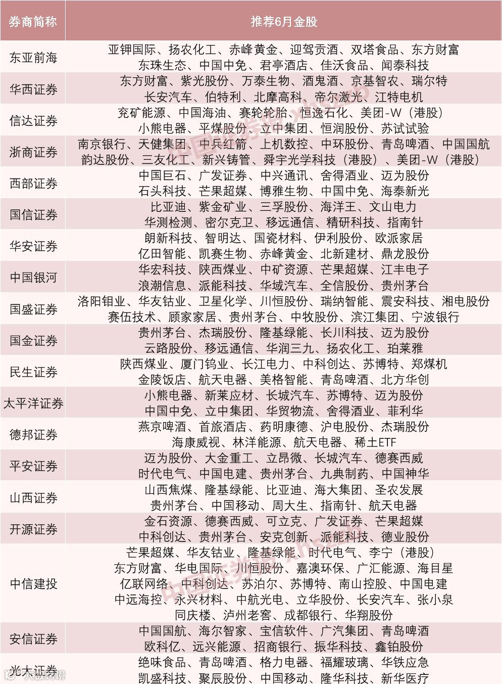 19家券商6月金股组合