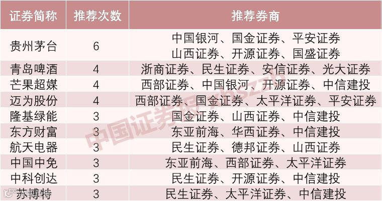 青岛啤酒、芒果超媒、迈为股份3只个股均获得4家券商的联合推荐。