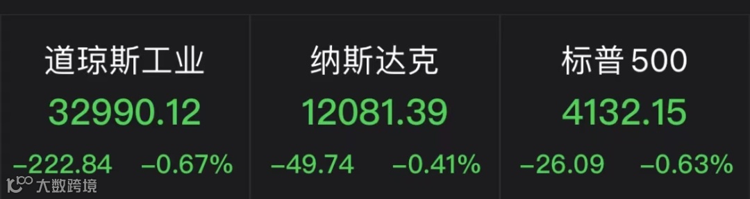 当地时间5月31日,美股三大股指集体下跌。标普500指数跌26.09点,跌幅0.63%,报4132.15点;道琼斯工业平均指数跌222.84点,跌幅0.67%,报32990.12点;纳斯达克综合指数跌49.74点,跌幅0.41%,报12081.39点。