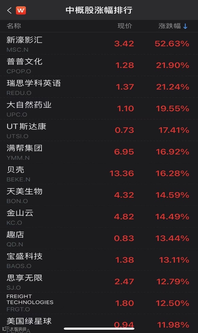 热门中概股多数上涨。其中,新濠影汇涨52.63%,普普文化涨21.9%,瑞思学科英语涨21.24%,满帮集团涨16.92%,贝壳涨16.28%,天美生物涨14.59%,金山云涨14.49%。