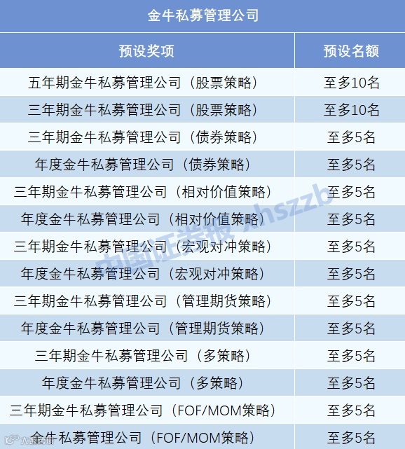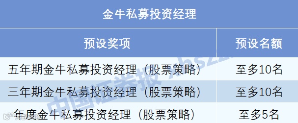 其一,为突出长期评价原则,本届评选将“年度金牛私募投资经理(股票策略)” 的预设获奖名额缩减至“至多5名”。