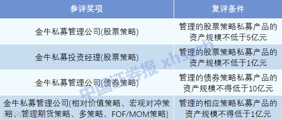 各项指标加权后排名靠前的公司,授予“金牛私募管理公司”。其中,获奖私募管理机构管理的产品参评期间整体净值增长率应处于同类型策略的前40%(指数增强类除外)。