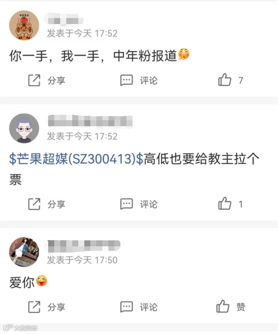 与此同时,芒果超媒的股吧也沸腾了!不少王心凌的粉丝在股吧高喊:“你一手,我一手,甜心教主台上扭”,纷纷表示要为王心凌买入芒果超媒的股票。