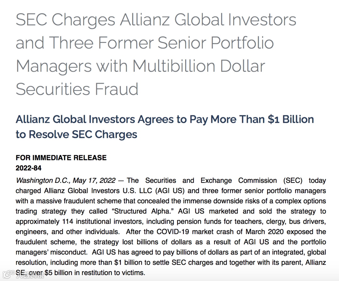 据SEC公告,SEC指控AGI US和三名前高级投资经理实施大规模欺诈计划,AGI US承认指控内容,并与其母公司安联集团(Allianz SE)一起向受害者赔偿58亿美元。