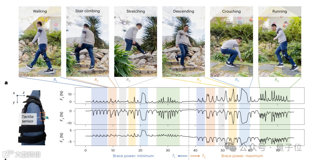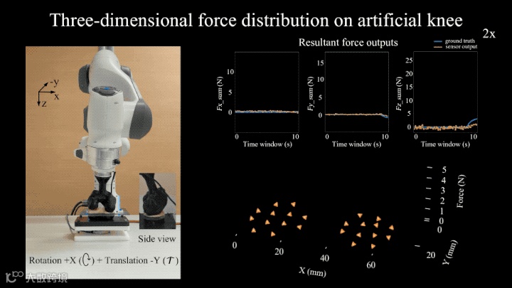 研究人员还展示了柔性PCB基底的触觉传感器在可穿戴设备中的应用。如下图所示,通过将一个具有柔性PCB基底的触觉传感单元放置于膝盖支架(knee brace)内侧,我们可以监测使用者在日常活动过程中膝盖支架与腿部的三维接触力,这展示了三维柔性触觉传感器在健康监测领域的潜在应用。
