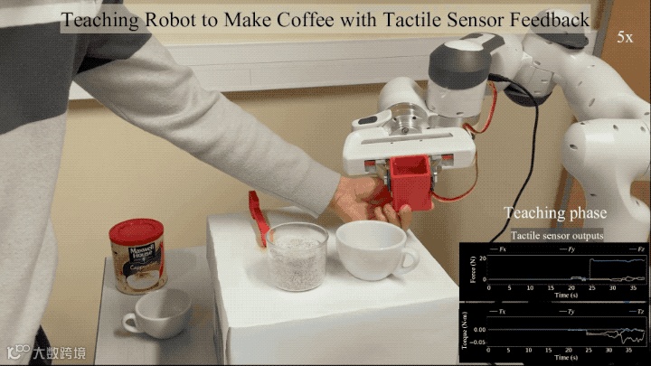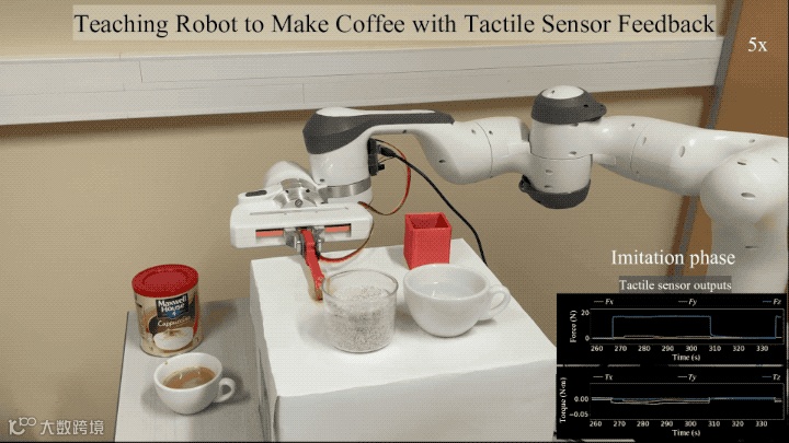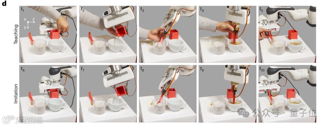 示教结束后,机械臂及夹爪只需要重复示教过程中记录的运动轨迹及开合状态即可完成咖啡的制作。研究人员表示由于未使用视觉反馈,轨迹重复阶段所有物品的位置都需与示教阶段一致,之后可通过引入视觉反馈和AI算法来实现更加智能和通用的模仿学习。