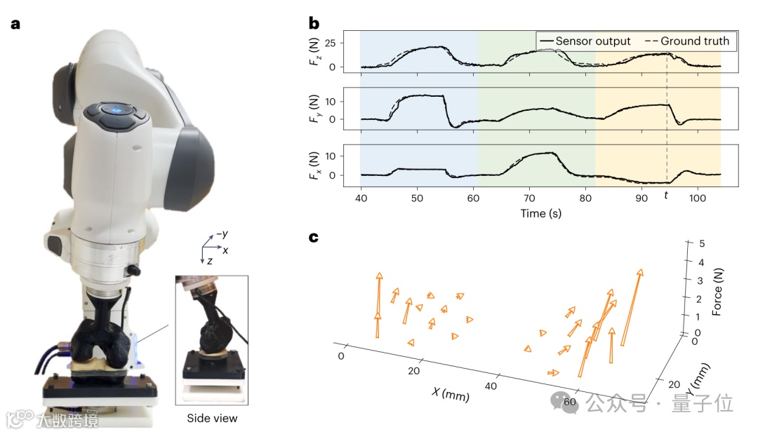 实验显示,触觉传感器可以提供实时的三维力分布测量,且测得的合力与真实值(来自ATI传感器)误差很小。