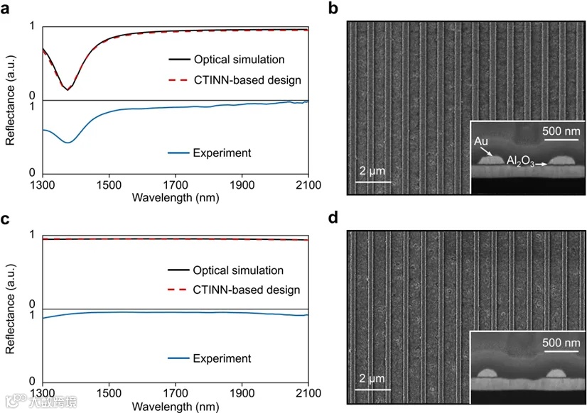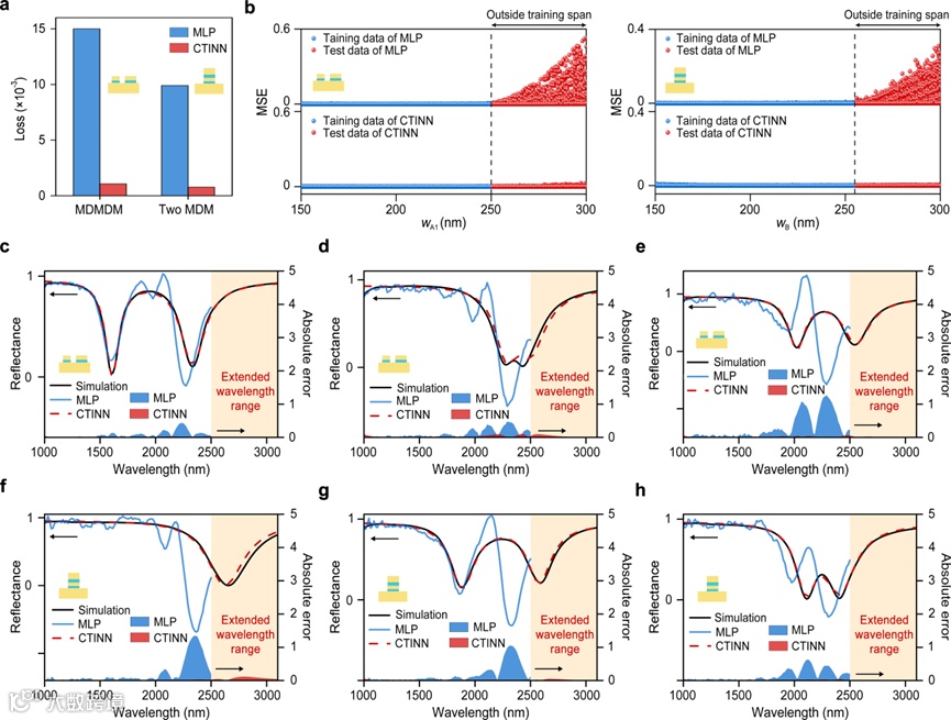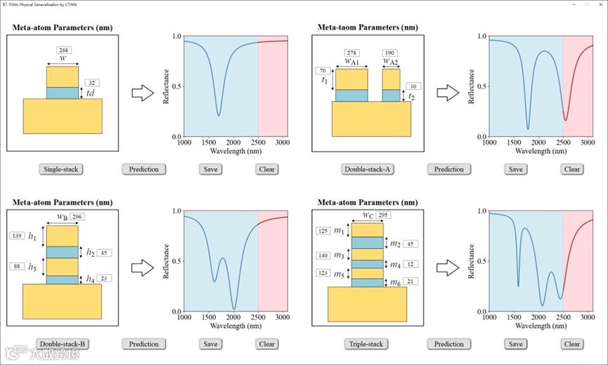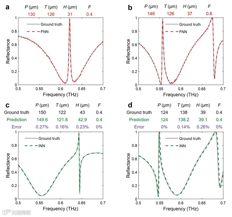 研究人员首先对所提出的深度学习设计方法的性能进行了评估。图2展示了随机挑选的测试案例,结果表明,无论光谱呈单峰还是多峰/谷特征,前向神经网络(FNN)的预测结果与光学模拟的真实值高度一致。同时,逆向神经网络(INN)的预测误差相较于实际结构的真实值低于0.27%。这些结果充分表明该方法能够为超构光栅的正向和逆向设计提供可靠的深度学习架构。