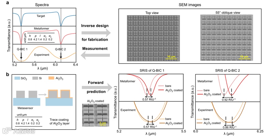 为了验证深度学习设计,课题组基于Metaformer深度学习框架设计了高性能Q-BIC超表面传感器并进行了表征与测量(如图3所示)。实验结果表明其共振波长与深度学习设计具有良好的一致性,这意味着所提出的深度学习设计方法在指导实际指纹检测传感器方面具有良好的潜力。此外,面灵敏度预测的实验结果表明:Metaformer框架预测得到的2个Q-BIC对应的面灵敏度与共形氧化铝后实验测得的超表面传感器对应的面灵敏度吻合良好,这证实了Metaformer在实现超表面传感器快速智能设计方面具有显著潜力。