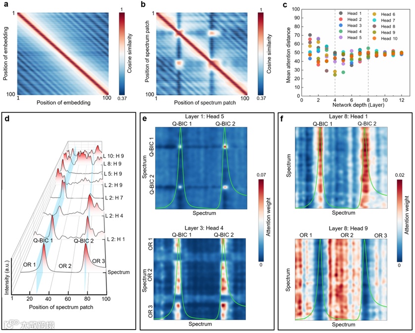 深度学习模型通常被认为是黑盒模型,难以解释其在学习过程中的学习机制,这阻碍了研究者对深度学习的理解和进一步开发。Transformer模型得益于其强大的多头自注意力机制,被广泛用于解释模型特征提取机制,并可根据输入序列的相关性分配不同权重,以实现准确的预测结果。正如苏轼曾在《题西林壁》中写到“横看成岭侧成峰,远近高低各不同”那样,不同的视角可以观测到事物的不同特征。多头注意力机制中的不同Head也可以从不同视角关注到不同的物理光学特征。该工作对不同网络层数以及不同Head的注意力权重进行了探讨分析(如图2所示),结果表明不同Head可以实现对光学响应的Q-BIC 1、Q-BIC 2以及其它非谐振区域的物理特征进行有效学习捕捉。此外,随着网络层数的不断增加,每个Head将会注意到更多特征不明显的非谐振区域,直至最后实现深度学习模型对光学响应中的主要物理光学特征学习从而实现精准预测。该结果阐释了深度学习模型对于光学特征的学习机制,有助于促进超表面传感器智能设计的理解与开发。