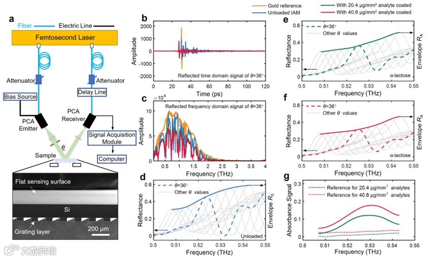 在上述理论分析的基础上,研究人员制备了硅基倒置超构光栅,并利用反射式的太赫兹光路进行了痕量α-乳糖分子的宽带指纹传感检测实验验证(图4)。结果显示在0.529 THz的指纹特征频率点处,对于20.4 μg/mm²和40.8 μg/mm²的痕量α-乳糖,指纹峰处的吸收强度分别从传统方法的1.3%和3.1%提升到了12.1%和17.7%,对应的最大增强因子分别为9.3倍和5.7倍。该IAM指纹传感的实验数据与图3中的仿真设计结果表现出了良好的一致性,证明我们的方法可以实现痕量分子指纹宽带增强检测。