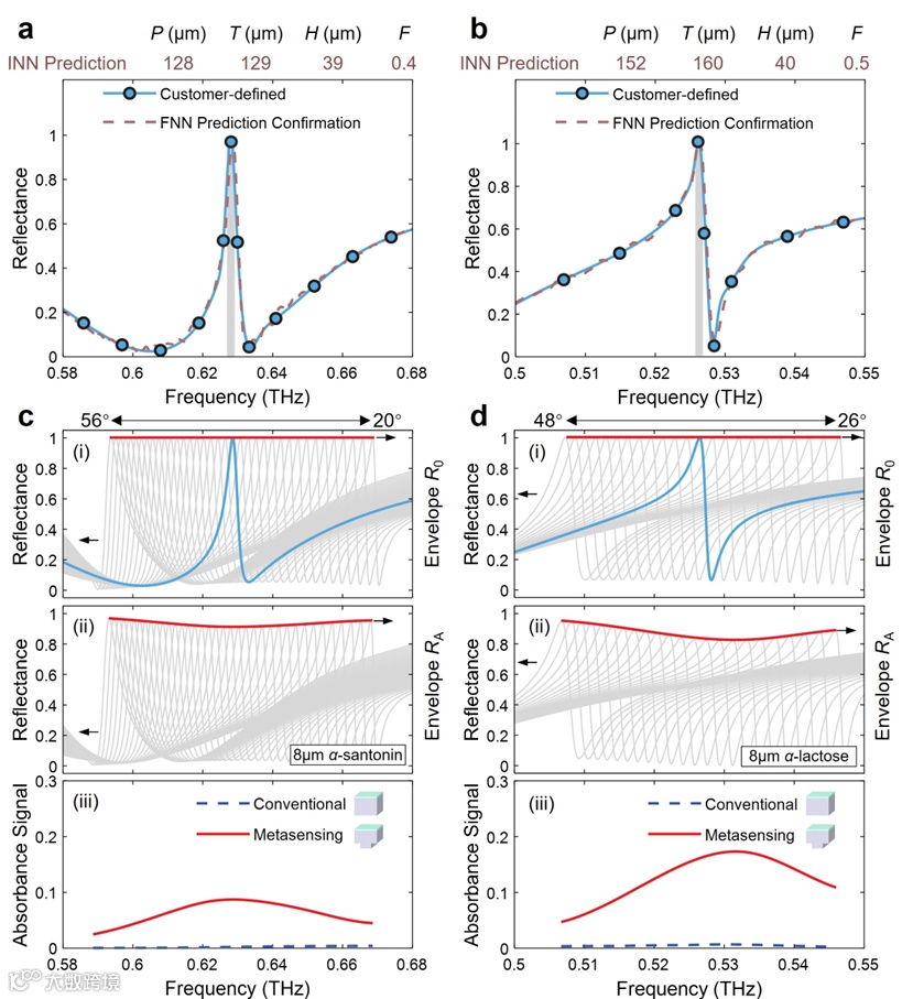 接下来,将训练好的FNN和INN进行级联构成双向网络,用于太赫兹指纹超构光栅传感器的实时按需设计。针对两种常见分析物α-蛔蒿素和α-乳糖,图3中呈现了相应的超构传感器设计范式。考虑到在角度分辨太赫兹光谱的实际测量中,实验入射角通常在16°到56°之间,并且IAM的共振峰会随着角度的增加向较低频率移动。因此,根据分析物指纹特征的频率位置,研究人员利用所设计的深度学习网络模型,对入射角度为36°的太赫兹指纹传感器件的反射光谱进行了按需设计,共振峰位置与待测物指纹特征频率非常吻合。进一步结合角度多路复用技术,通过识别样品加载前后反射谱线的宽带共振包络变化,从而实现痕量指纹检测。