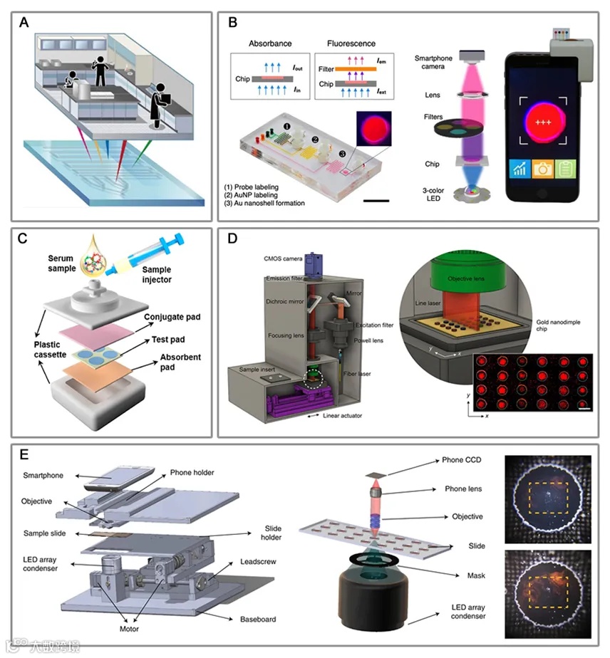 便携式检测设备:小型化策略促进了手持检测仪的研发。例如,基于纸张的SERS生物传感器和化学荧光信号增强设备,在癌症和结核病检测中表现突出。虽然便携设备提高了检测灵活性,但仍需解决激发波长选择性和系统噪声等问题。