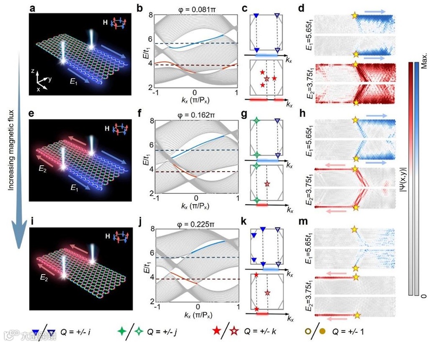 图2展示了通过磁场对Kagome晶格中多带隙反手性边界态拓扑特性的灵活调控。图2a, 2e, 2i显示了多带隙反手性边界态的示意图和结构变化。不同磁场条件下,边界态展现出显著的方向性和带隙依赖性。图2b, 2f, 2j展示了在不同磁通条件下,边界态和体态能带分布。灰色曲线代表体态分布。红色和蓝色曲线分别对应两个带隙(Gap Ⅰ和Gap Ⅱ)中的反手性边界态。随着磁场增强,带隙中的边界态长度、位置和方向随之改变。带隙内的非阿贝尔拓扑节点位置的演化直接决定了不同边界态的出现与消失。图2c, 2g, 2k展示了在布里渊区内不同带隙中拓扑节点的位置以及对应的Zak相位。图2d, 2h, 2m通过时间动态计算展示了边界态的传播特性。