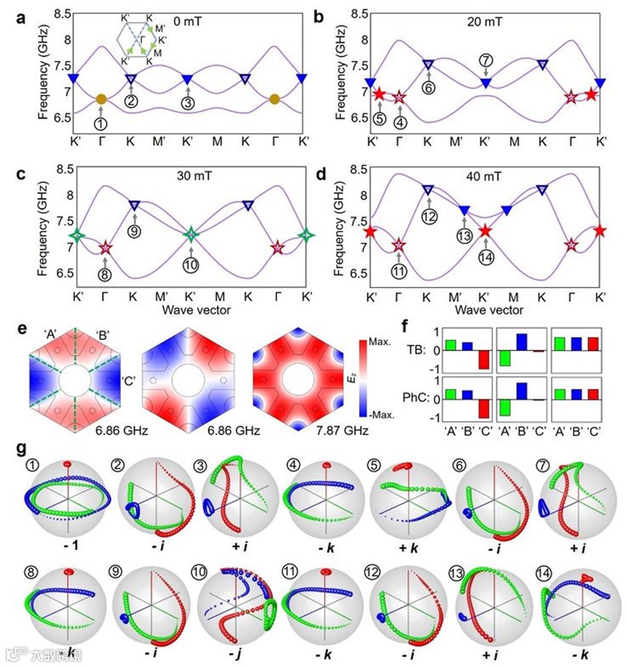 图3展示了通过设计旋磁光子晶体,对非阿贝尔拓扑特性进行理论验证和实验实现的细节。未施加磁场时光子晶体的体带结构如图3a所示,布里渊区的Γ点处存在一个二次节点(棕色球),K点和K′点各有一个狄拉克节点(蓝色三角形)。图3b, 3c, 3d展示了磁场调控下非阿贝尔拓扑节点的动态演化。光子晶体的单元格可以分为三个区域(A, B, C),分别对应Kagome晶格的三个子晶格点(图3e)。将其与理论计算的Kagome晶格模式进行类比,验证了旋磁光子晶体的设计能够有效模拟Kagome晶格。图3g展示了非阿贝尔拓扑荷的演化轨迹,蓝色、绿色和红色曲线分别对应第一、第二和第三能带。